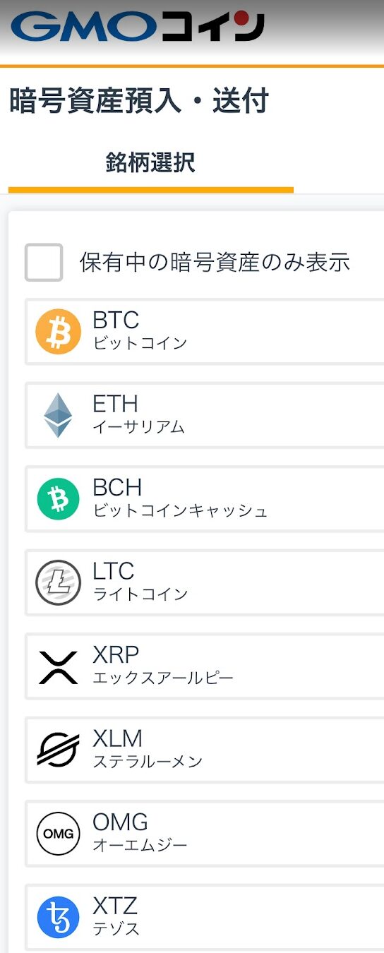 GMOコインの「暗号資産預入・送付」画面から送金したい暗号資産を選びます。